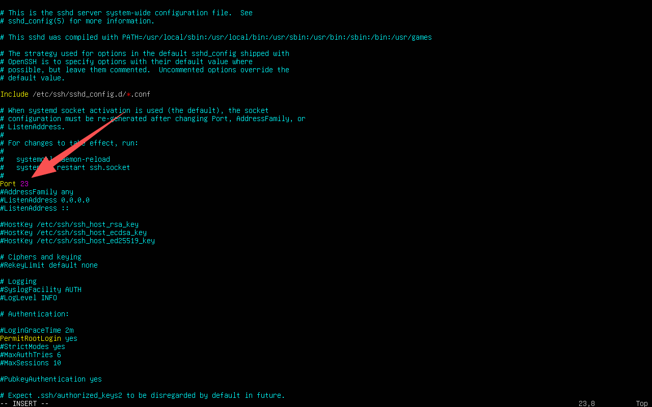 修改 sshd_config配置文件中,#port 22 的位置 去掉# 并将22改为想要改的端口 比如下图改为23